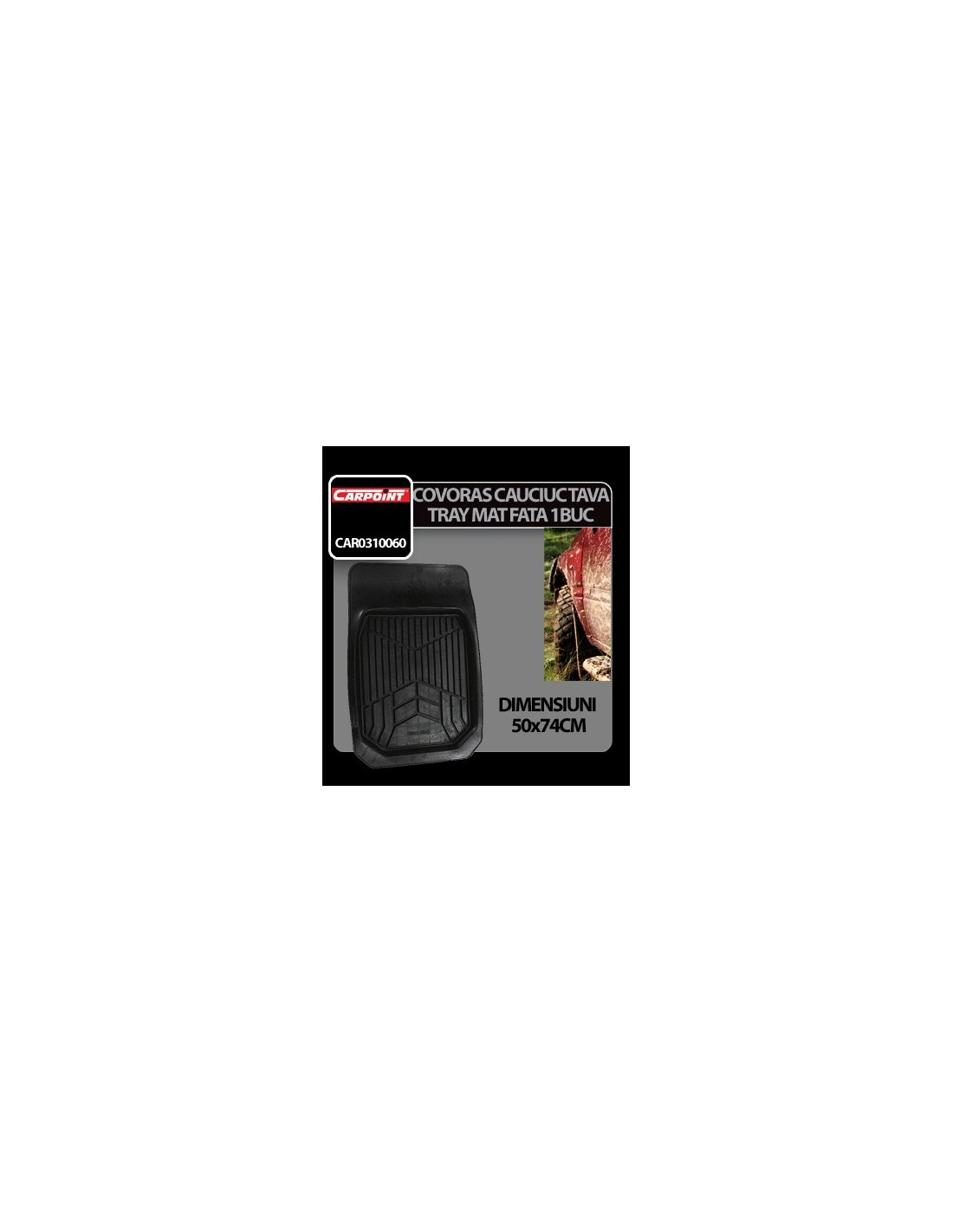- CAR0310060Descriere: Covorasul este confectionat 100% din cauciuc de culoare neagra si are marginile ridicate pentru a mentine murdaria sau zapada pe acesta. Se utilizeaza la bancheta din fata si se vinde la bucata.Dimensiuni: 74x50 cm