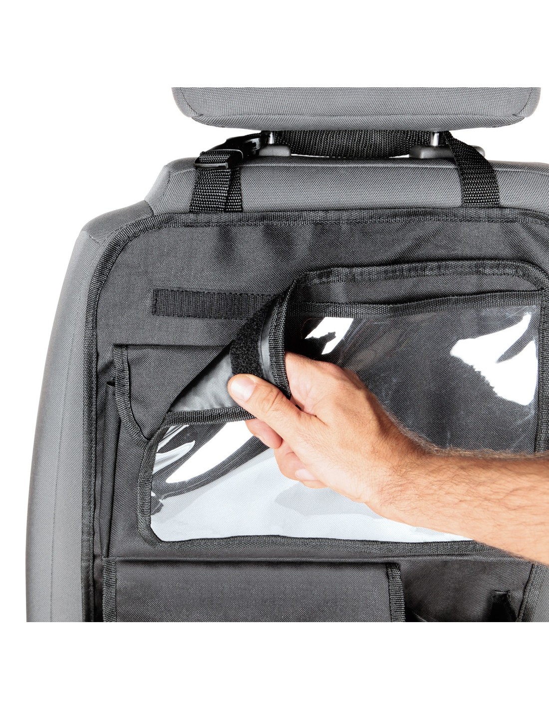 lam40102 descriere: sistemul de fixare a cataramei reglabil pentru o fixare usoara a organizatorului pe majoritatea spatarelor scaunelor pe partea din spate la autoturisme suvuri si furgonete. 3 buzunare + 1 suport pentru tableta 2 buzunare mari de depozitare si 1 suport pentru bauturi ofera acces rapid la articolele utilizate frecvent. 1 buzunar transparent pentru tableta detasabil permite functionarea ecranului tactil. material durabil usor de curatat.